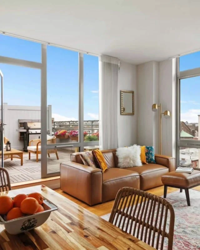 Enter into a generous living and dining area where oversized windows frame views of the city, bathing the space in natural light. -